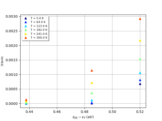 Following this approach, we compute lifetimes on a 90×90×90 \(\kk\)- and the integration is perfomed on the same \(\qq\)-mesh. You can then run again the transport driver only, by setting eph_task 7 and transport_ngkpt 45 45 45 to downsample the \(\kk\)-mesh used to integrate the mobility in \(\kk\)-space. This second option has the advantage that it delivers two mobilities in one-shot but it would be overkilling if a 45×45×45/90×90×90 k/q sampling is already enough.