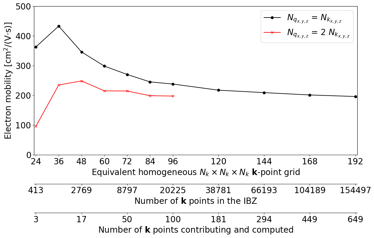 Once the energy window is set, we can start to converge the mobility with respect to the dense \(\kk\)- and \(\qq\)-meshes. The previous computations used 24×24×24 \(\kk\)- and \(\qq\)-meshes. This is quite far from convergence. Just to give you an idea, silicon requires a 45×45×45 \(\kk\)-mesh and 90×90×90 \(\qq\)-mesh to reach convergence within 5%.