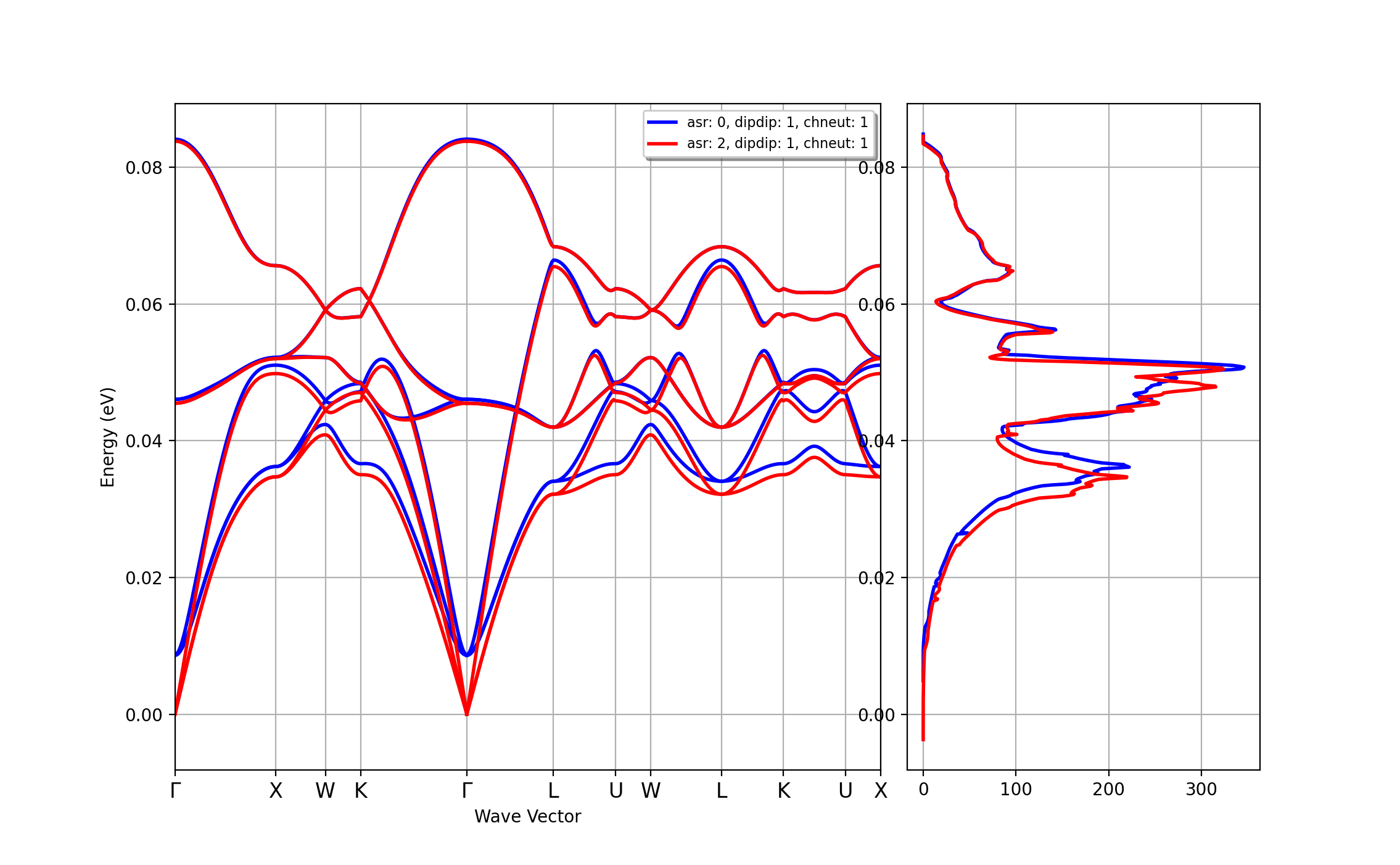 The AbiPy script used to executed the DFPT part is available here. Note that several parameters have been tuned to reach a reasonable compromise between precision and computational cost so do not expect the results obtained at the end of the lesson to be fully converged. More specifically, we use norm-conserving pseudopotentials with a cutoff energy ecut of 30 Ha (too low, it should be ~50 Ha). The DFPT computations is done for the set of irreducible \(\qq\)-points corresponding to a \(\Gamma\)-centered 4x4x4 \(\qq\) mesh (again, too coarse). \(\bm{Z}^*\) and \(\bm{\ee}^\infty\) are also computed with the same underconverged settings.