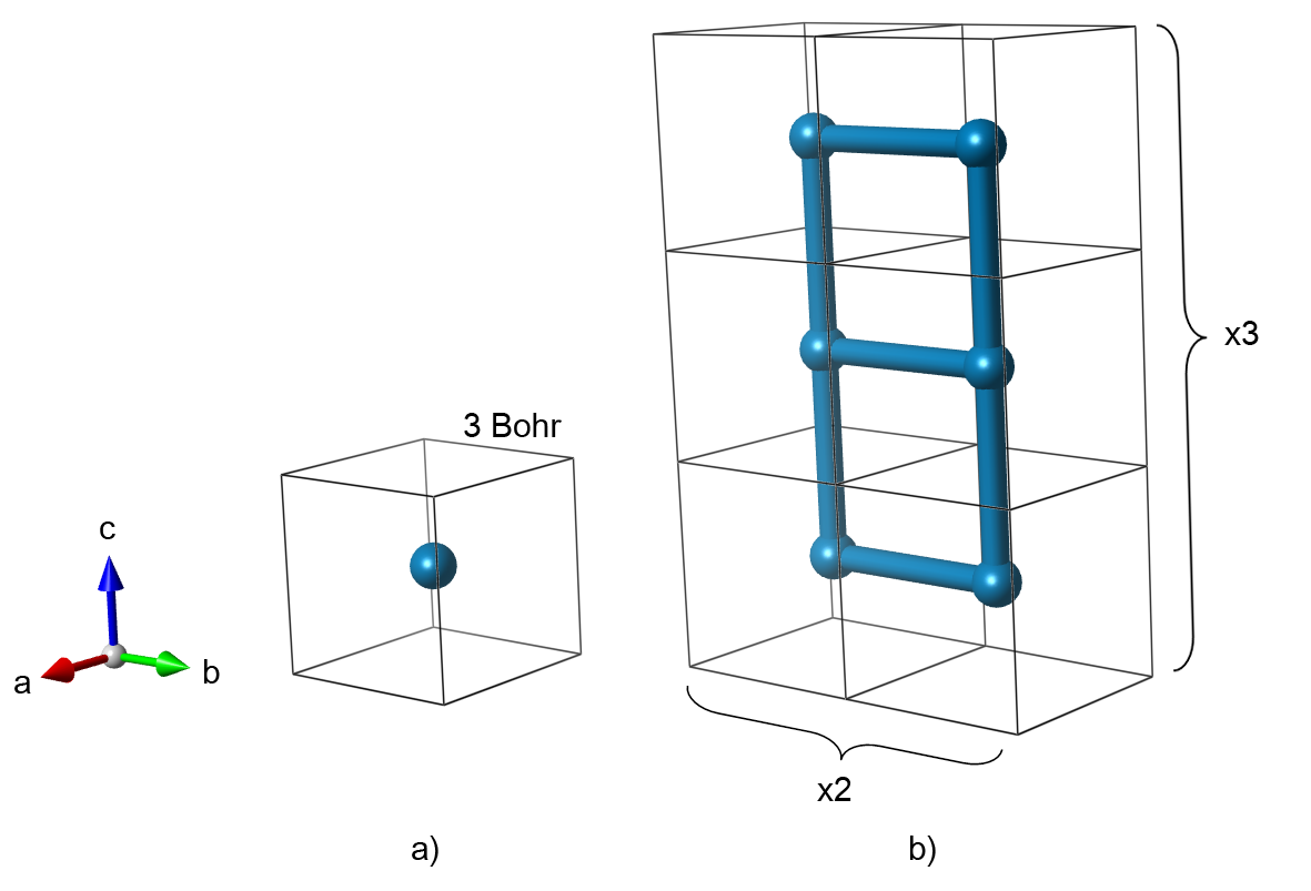 - Fig. 1: Primitive unit cell (a) and 1x2x3 supercell (b) that represent a cubic lattice of hydrogen atoms.