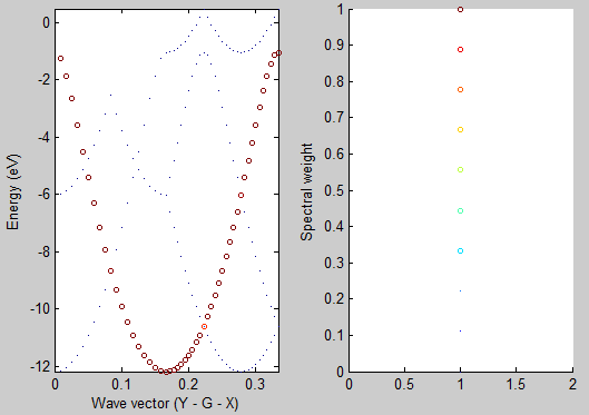 Lets visualize the unfolded band structure. It is different from a regular band structure plot, though. Now we have one additional dimension – the Bloch spectral weight. There are several alternative visualization strategies. Here we use the scatter plot with the point size proportional to the spectral weight. The following MatLab script will help you build a graph for any fold2Bloch output: ubs_dots.m