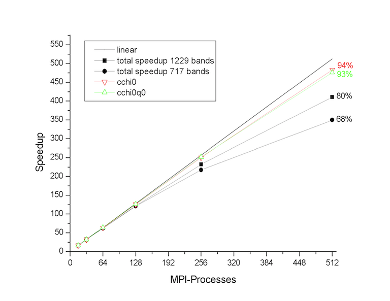 Tests performed at the Barcelona Supercomputing Center (see figures below) have revealed that the first and the second part of the MPI algorithm have a very good scaling. The routines cchi0 and cchi0q0 where the RPA expression is computed (step 1 and 2) scales almost linearly up to 512 processors. The degradation of the total speedup observed for large number of processors is mainly due to the portions of the computation that are not parallelized, namely the reading of the WFK file and the matrix inversion (qloop).